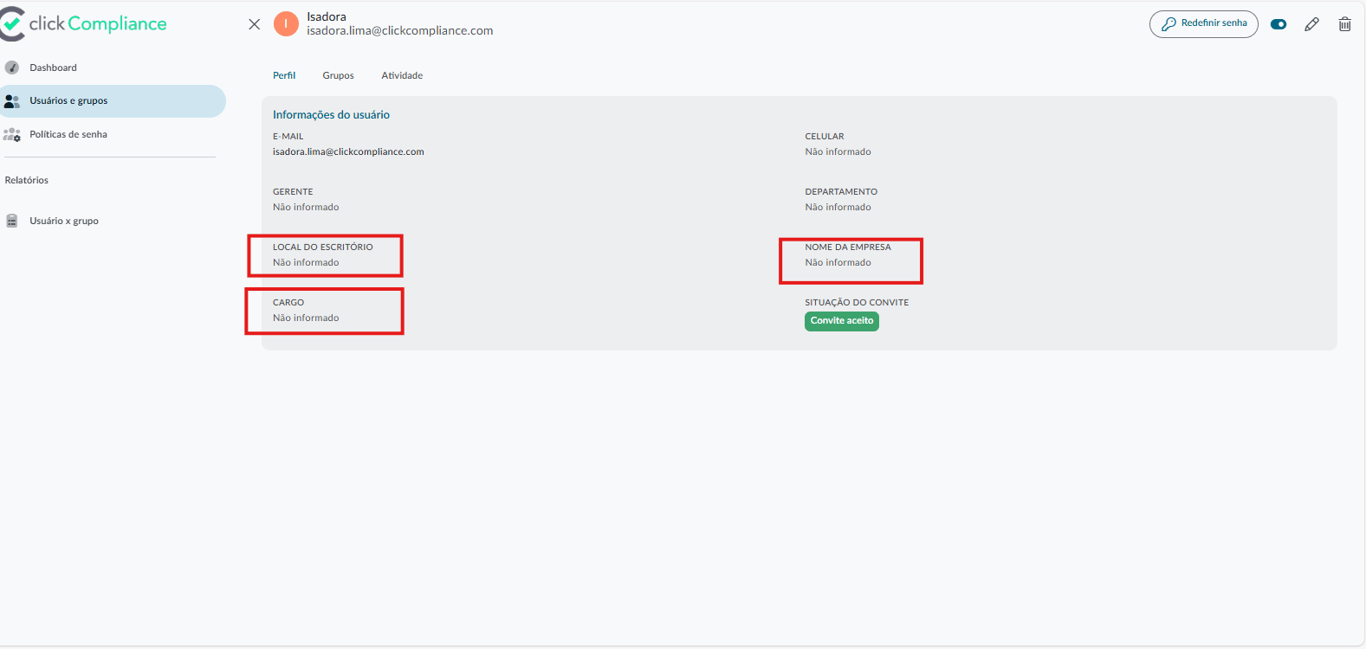 Além do campo "gerente" e "departamento", agora é possível adicionar o "local do escritório", "cargo" e "nome da empresa".