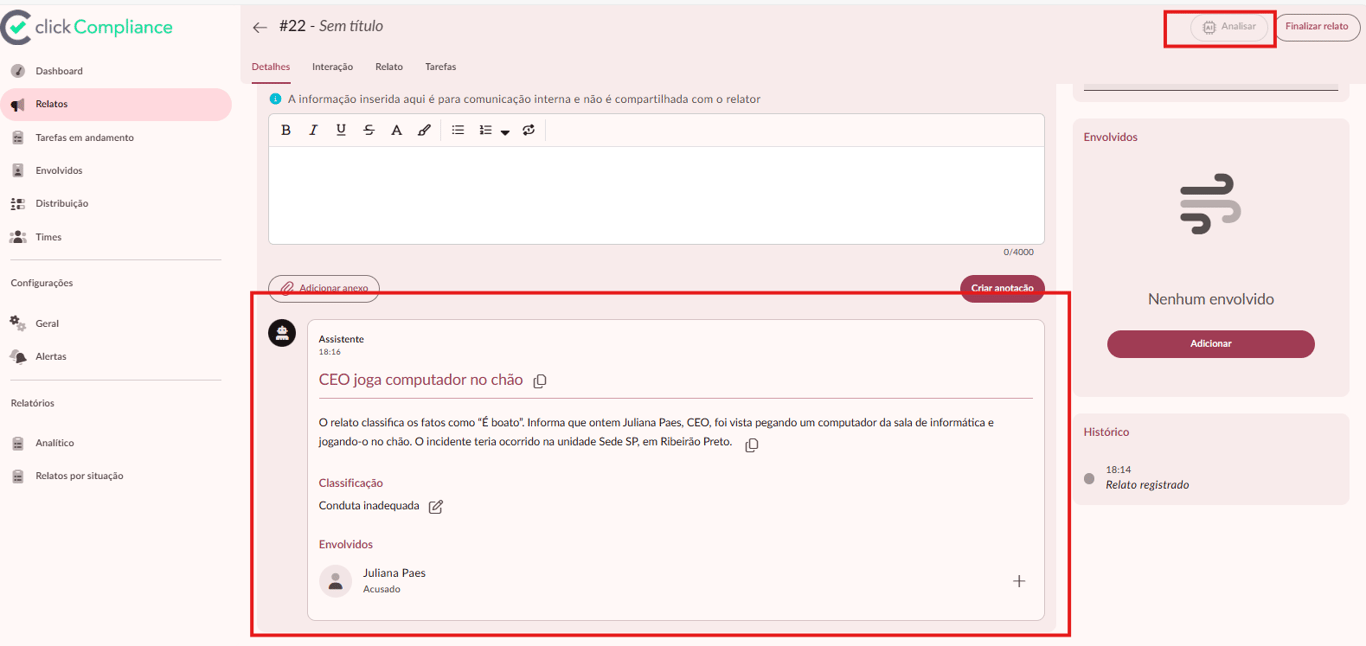 Ao clicar no botão "analisar", o assistente gera um resumo com uma sugestão de título, sugestão de envolvidos, um resumo da denúncia e a sugestão de classificação, caso entenda que a colocada pelo denunciante não condiz com o descrito no relato:
