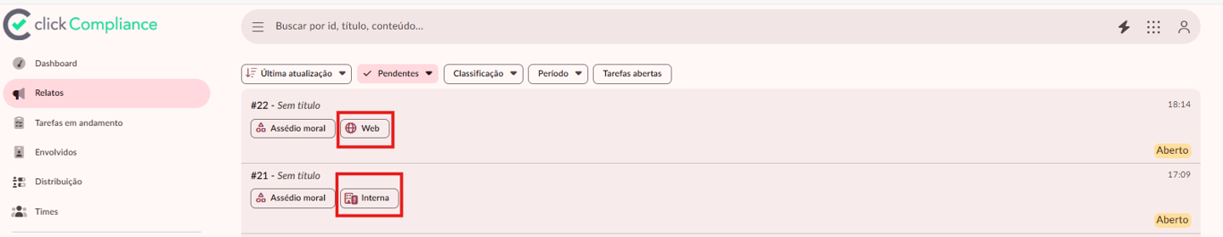 Agora, na aba de Relatos do canal de denúncias, é possível visualizar de forma rápida a origem de cada denúncia (por exemplo, Web ou Interna).