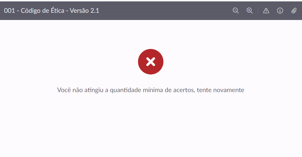 Agora é possível informar de maneira mais explicativa para o usuário que estiver efetuando o aceite de um documento, o porquê de não ter conseguido efetuar o aceite e também que ele deverá tentar novamente, caso não acerte a quantidade mínima de acertos.