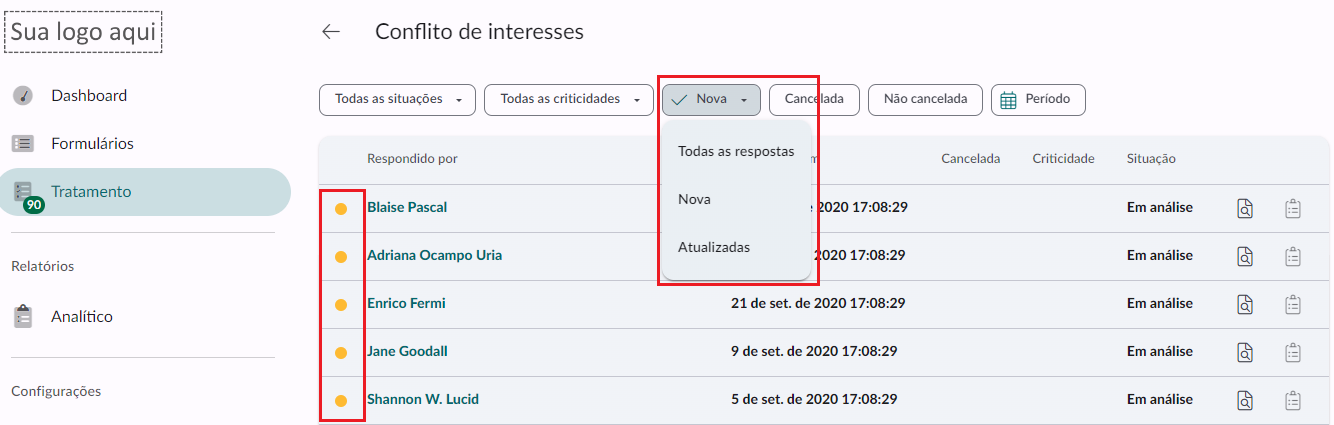 Agora é possível verificar uma marcação de "nova" na lista de respostas para tratamento. Também foi incluída a possibilidade de filtragem dessas novas respostas a serem tratadas, bem como filtrar apenas as que foram atualizadas.
