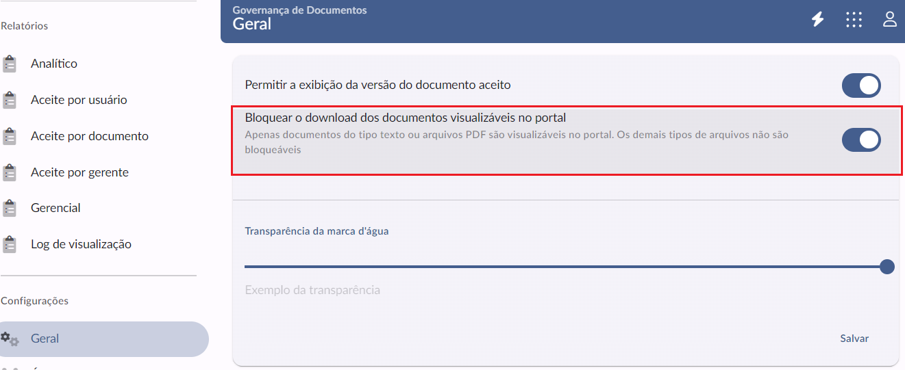 Agora é possível configurar ativando ou desativando o bloqueio de download dos documentos visualizáveis.