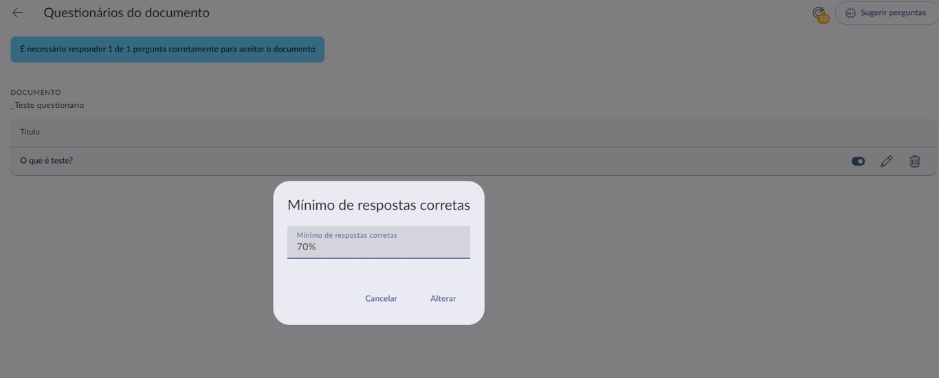 Agora é possível criar questionários após o documento de aceite com mínimo de respostas corretas.