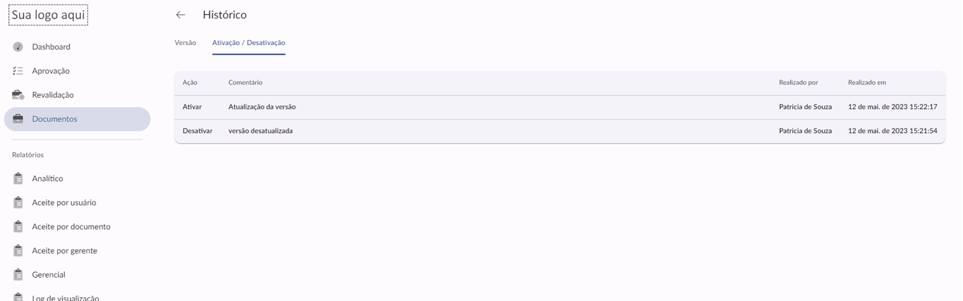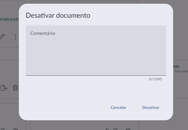 Agora quando você desativa um documento, abre uma caixa de comentário para que seja colocado o motivo pelo qual aquele documento está sendo inativado. Esse histórico fica guardado para futuras consultas.