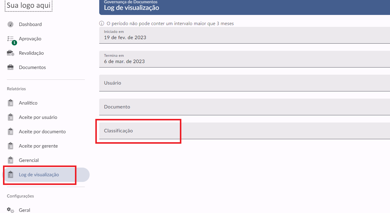 Agora no relatório de Log de visualização de Documentos é possível fazer filtro pela Classificação do Documento.