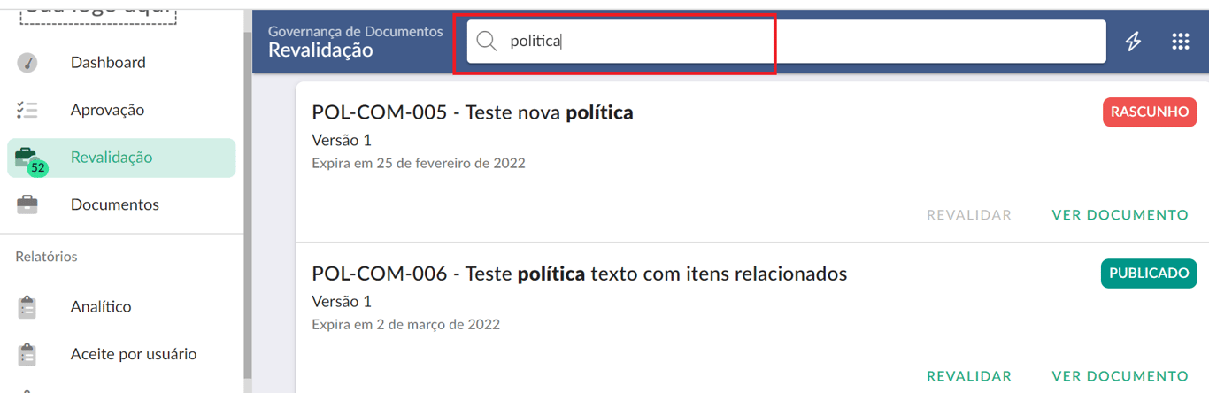 Agora é possível pesquisar um documento na fila de Revalidação.