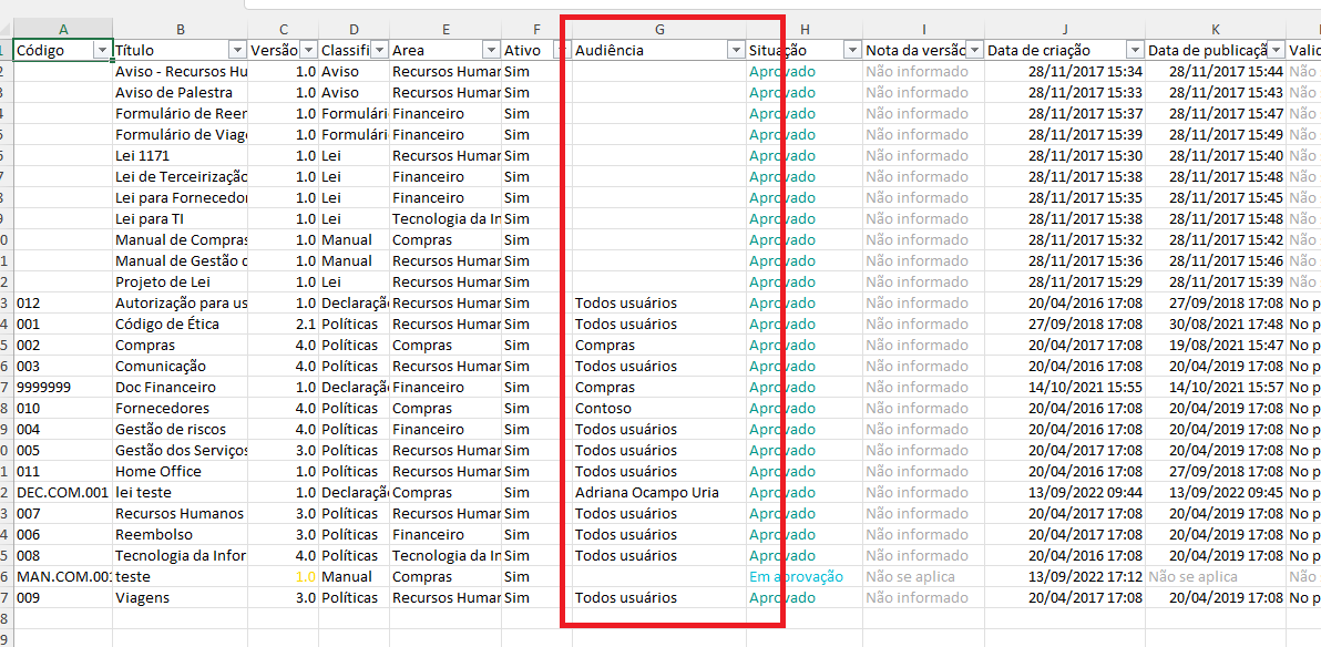 Foi criada uma coluna nova no relatório Gerencial. Agora, você pode consultar a Audiência de cada documento no próprio relatório.