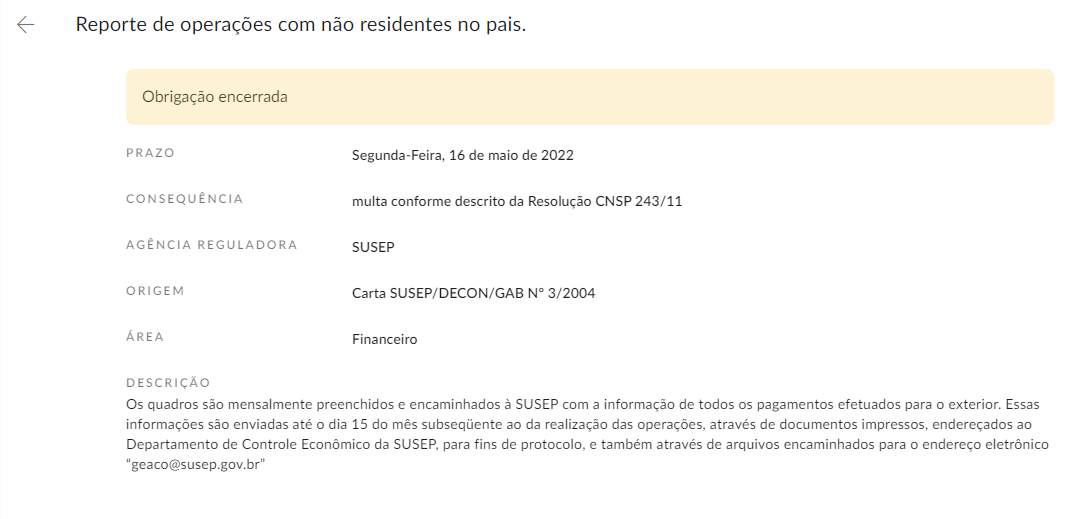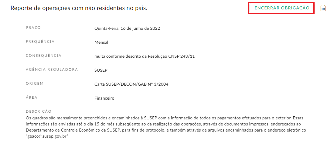 As obrigações agora podem ser encerradas. O encerramento excluí* todas as entradas da obrigação no calendário a partir de uma data selecionada. Ou seja, as entradas anteriores à data selecionada permanecem válidas. Após o encerramento da obrigação, nenhuma alteração de frequência pode ser mais efetuada, mas é possível fazer alterações pontuais nas entradas remanescentes.
