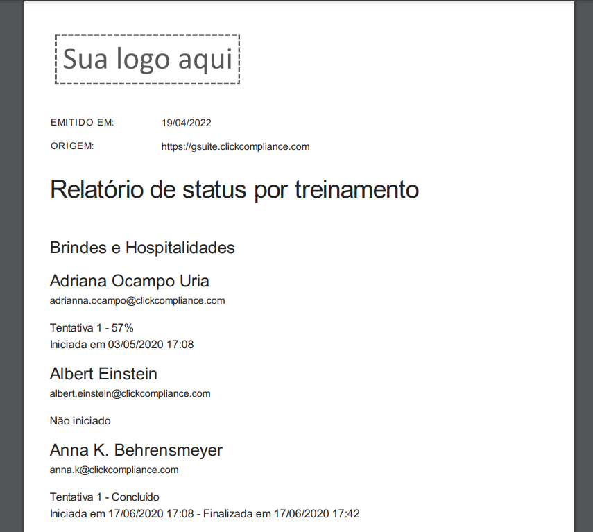 Exemplo do relatório de status por treinamento