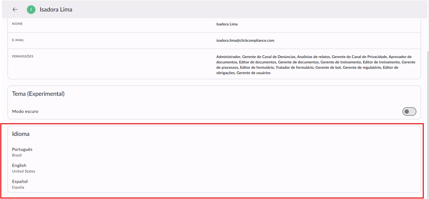 Em seguida, selecionar entre Inglês, Espanhol e Português o idioma de sua preferência: