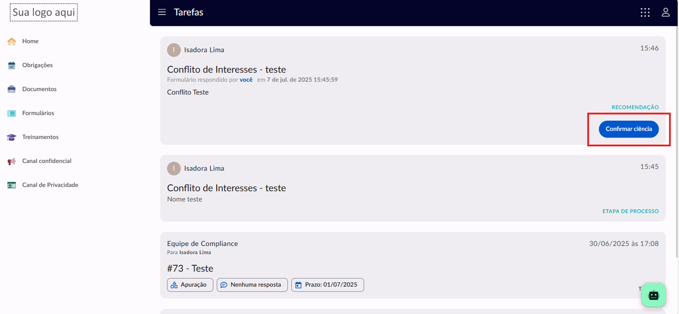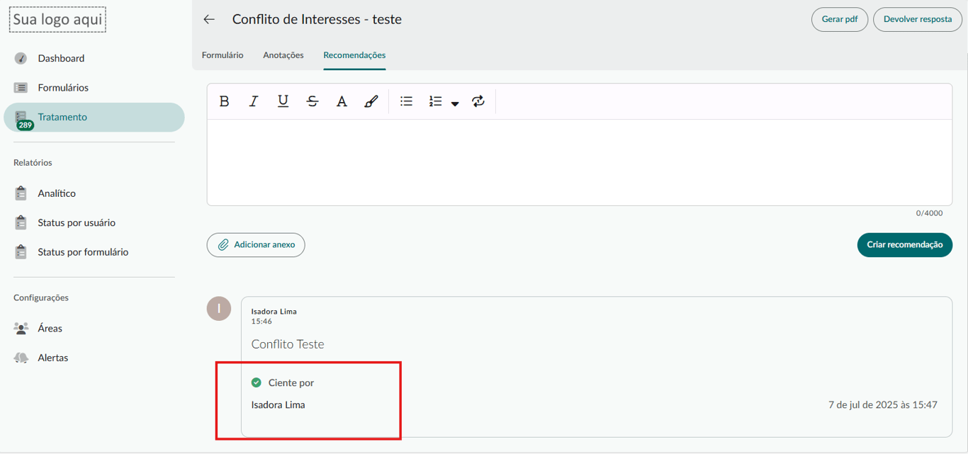 Agora, quem recebe recomendações no formulário, declara estar ciente.