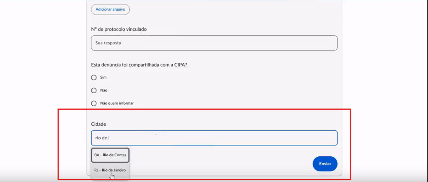 Agora é possível adicionar ao formulário do relato da denúncia o campo de cidade/município, para isso é necessário solicitar ao time de CS que faça a inclusão no seu formulário: