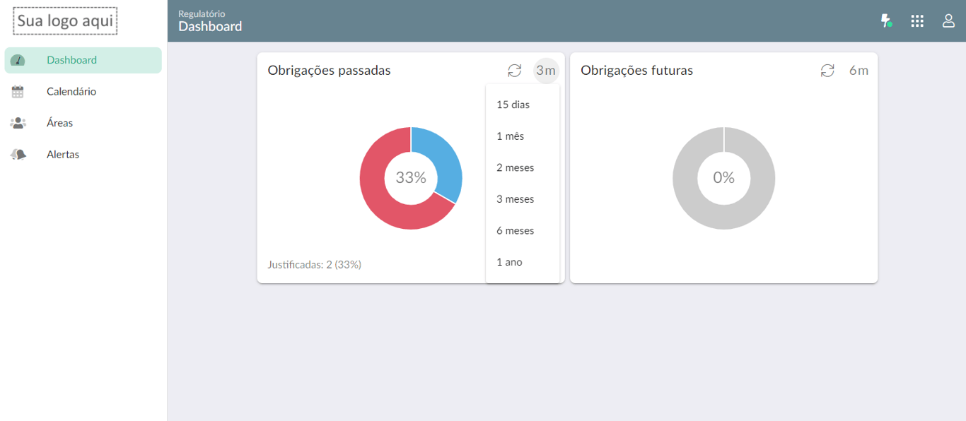 O módulo Regulatório ganhou novos dashboards de obrigações passadas e futuras que indicam o grau de cumprimento por período, exibindo os percentuais de: cumpridas, não cumpridas, justificadas e pendentes.