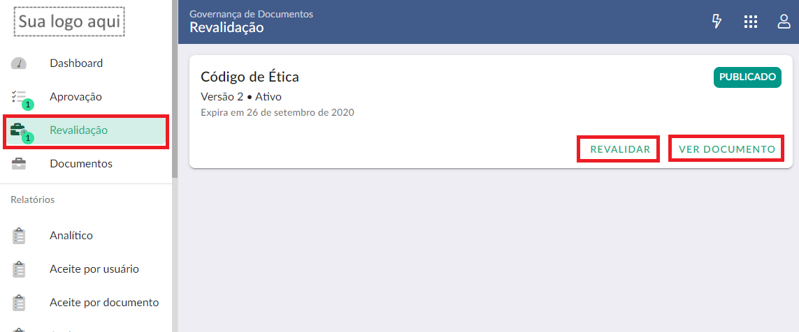 Importante ressalvar que o processo de revalidação se dá quando não há alteração no documento e no número de sua versão, neste caso, o documento ganha apenas um nova data de expiração. Tanto a revalidação quanto a revisão ou uma nova versão devem ser submetidas a um processo de aprovação.