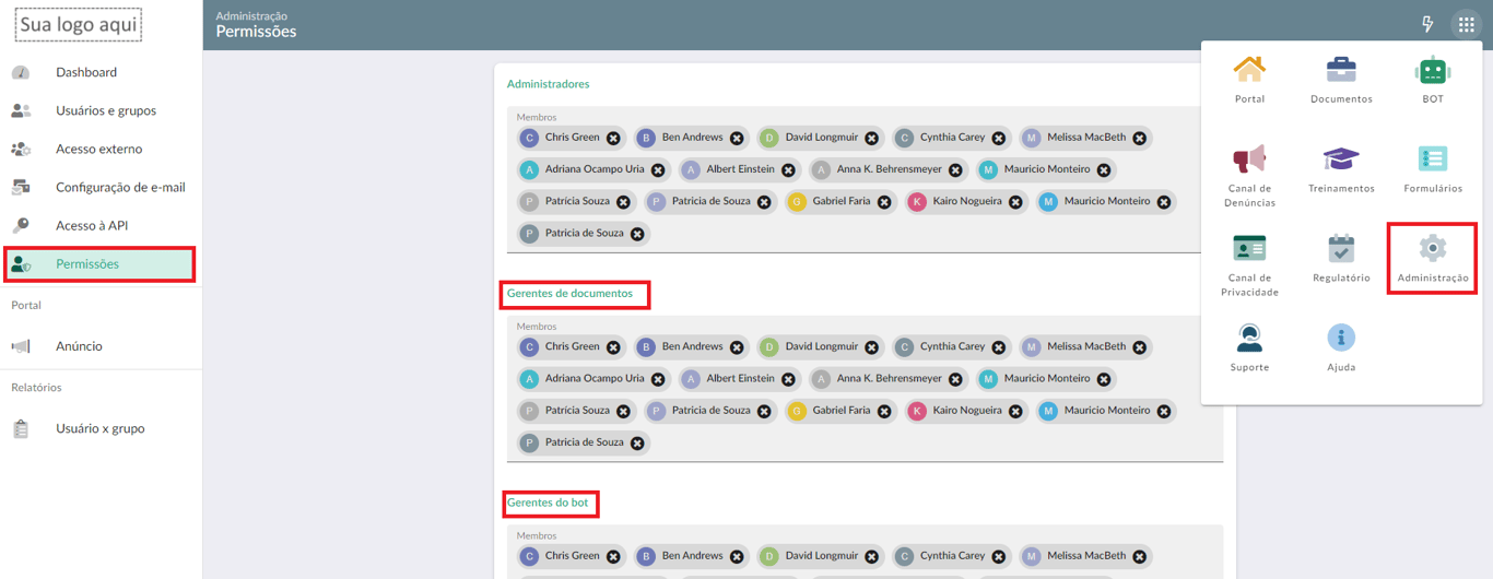 Gerentes dos outros módulos: As permissões são idênticas às de administrador antigas.