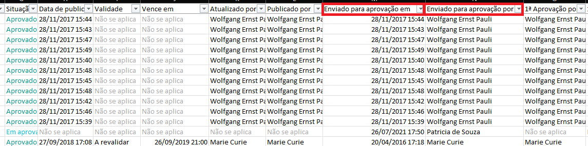 A planilha gerada no relatório gerencial de documentos possui duas novas colunas com as informações do envio para aprovação: "Enviado para aprovação em" e "Enviado para aprovação por".