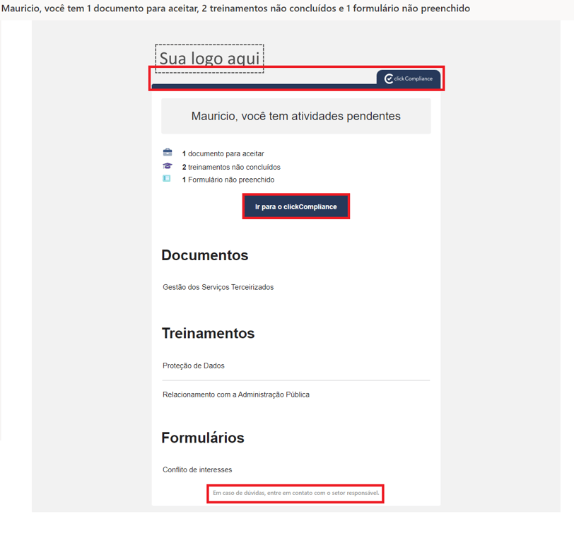 O fundo dos e-mails agora têm um padrão de cores mais neutro e a barra de título e botão serão na cor primária do cliente. Além disso, é possível colocar uma texto informativo no rodapé. Caso queiram esta configuração, favor nos contactar enviando o texto desejado.