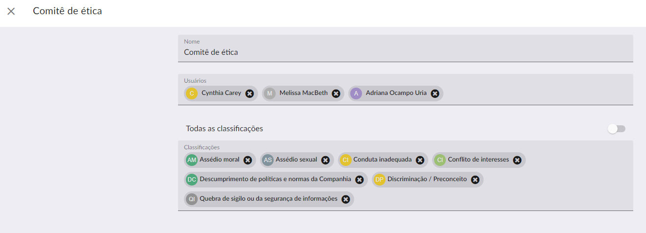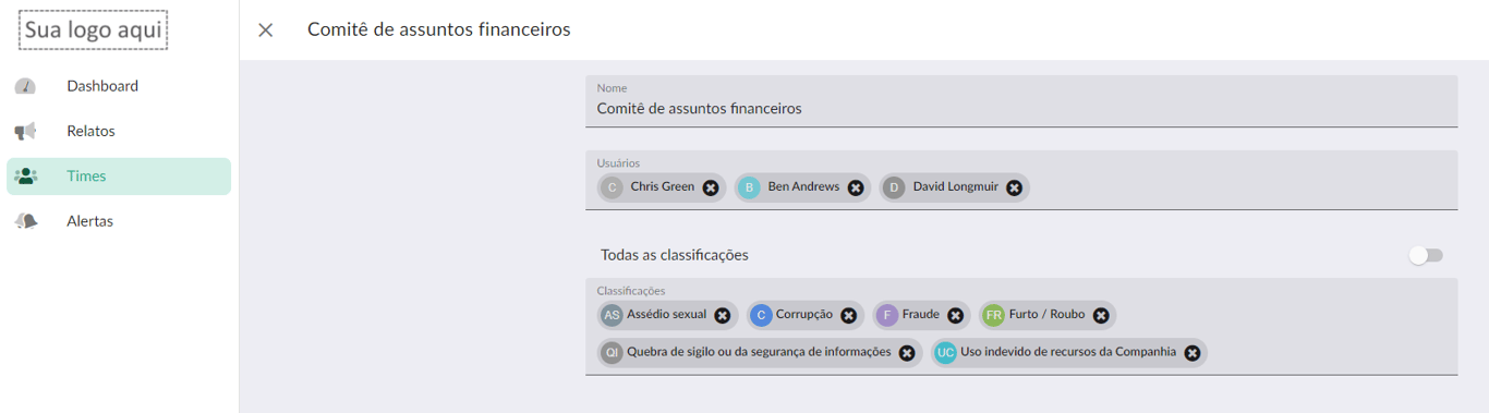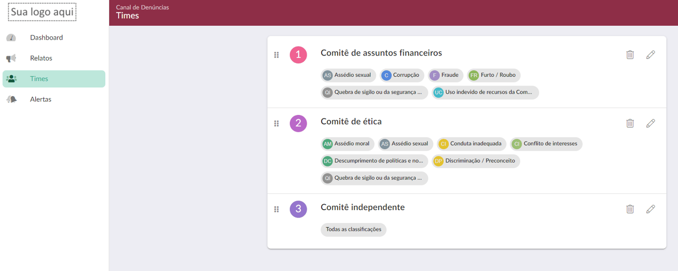 É importante saber que, caso todos os times possuam risco, o último na prioridade será o que receberá a denúncia para tratamento. Logo, este time deveria ser configurado com membros que possuam um maior grau de autonomia e isenção, considerados como última instância para este trabalho em sua empresa.