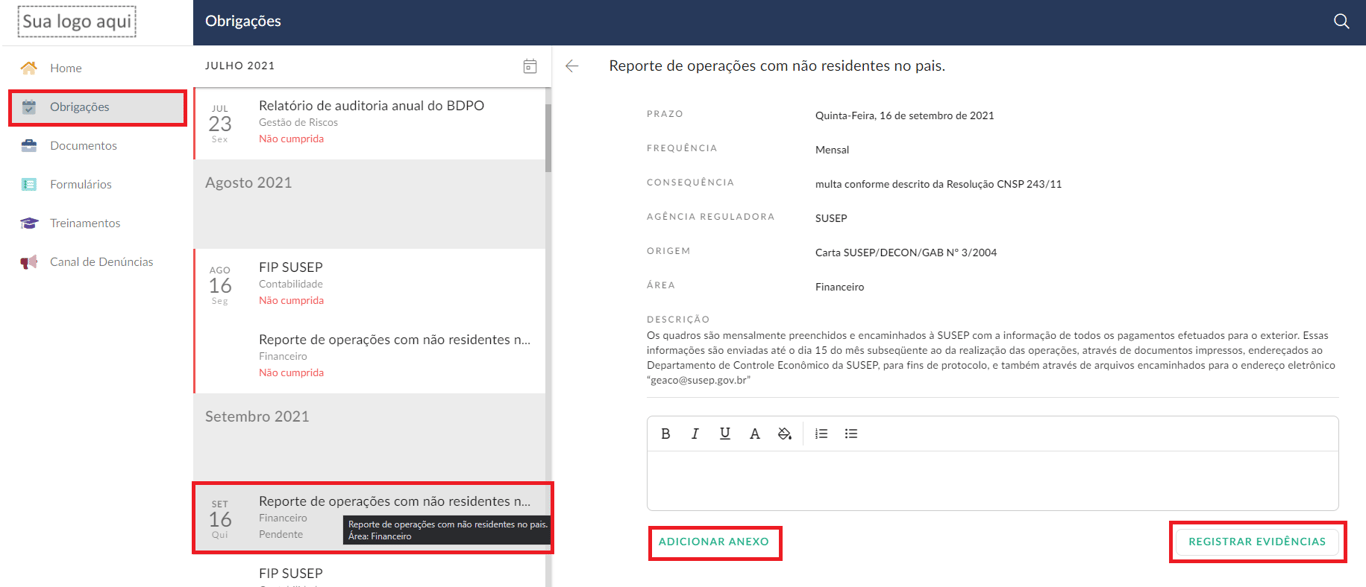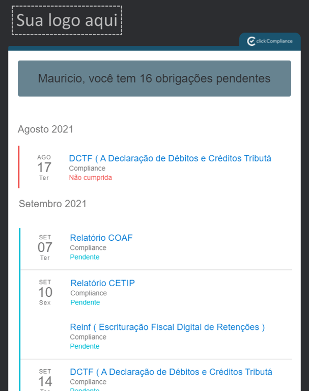 3) As obrigações são atribuídas aos responsáveis pelo cumprimento de cada área e alertas periódicos são enviados como lembretes. Qualquer mudança na obrigação, seja ela de data, leis, consequências, é sinalizada para os responsáveis terem ciência exatamente do que mudou.