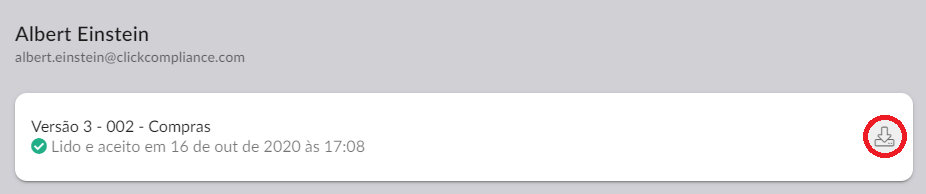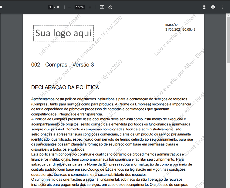 Os administradores ganharam uma nova opção que possibilita gerar uma impressão do documento aceito pelo usuário acessível pelos relatórios de aceite por usuário e por documento. Esta impressão estampa no documento uma marca d'água com o dados de registro de aceite (Texto informativo de aceite, nome do usuário e data do aceite)