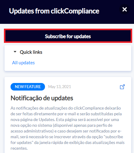 As notificações de atualizações do clickCompliance deixaram de ser feitas diretamente por e-mail e foram substituidas pela nova página de Updates. Esta página é acessível por uma nova opção no sistema (disponível apenas para perfis com acesso administrativo), mas caso desejem ser notificados por e-mail, será possível através da inscrição feita pela opção "subscribe for updates" da janela de atualizações recentes.