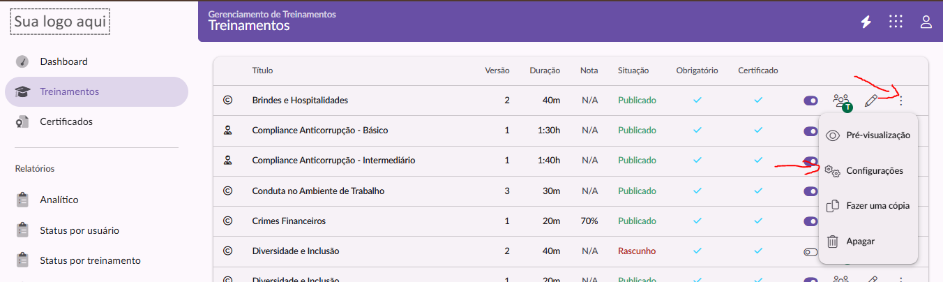 Na parte administrativa do Módulo de treinamentos, no menu lateral na opção ''Treinamentos'', bastar ir no treinamento desejado e clicar nos ''pontinhos'':